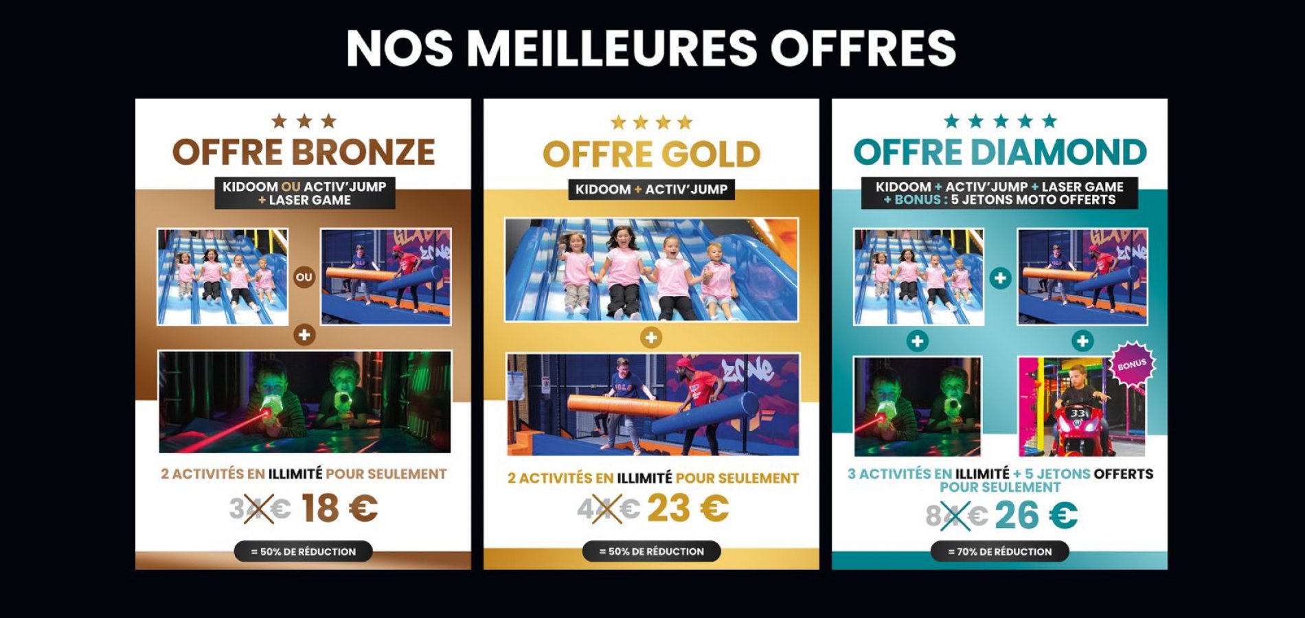 Vivez une expérience unique sur la région avec plus de 1 500 m² d’activités sur un même lieu : Aire de jeux KidOOm, Parc de trampoline Activ'Jump, Laser game Activ'Laser, VIP Box Karaoké, Jeux Arcade.